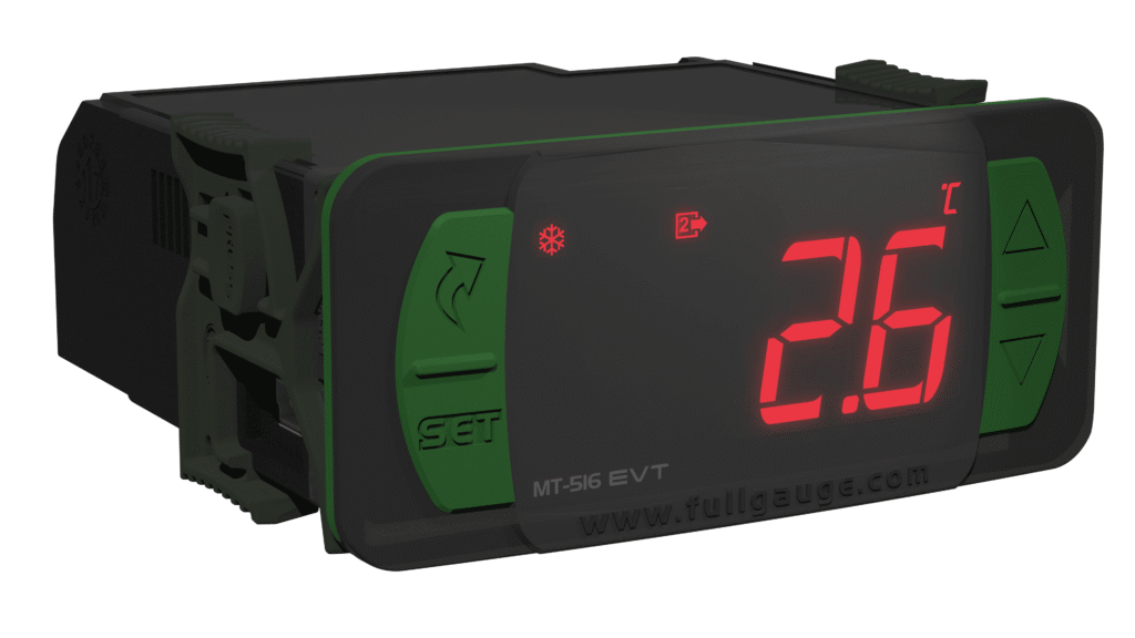 Thermostat with two 16A outputs for cooling or heating applications. The MT-516EVT has a cyclic timer and True RMS voltage monitor (from 90 to 300Vac) with programmable settings of minimum and maximum working voltages, which prevents, for example, the compressor from damage due to voltage fluctuations. It also has configurable digital input and functions to protect the equipment.